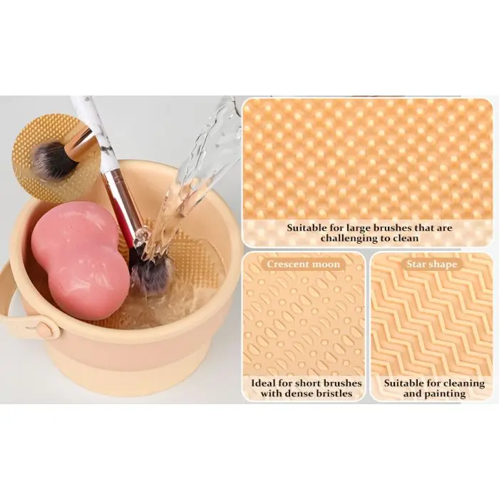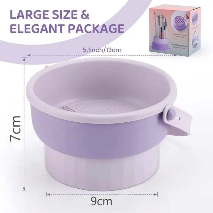 Fácil de usar: En primer lugar, expanda este recipiente de limpieza y vierta agua limpia en el recipiente, mueva suavemente y gire las cerdas sobre la superficie de limpieza, luego enjuague con agua tibia, finalmente sacuda el agua en los cepillos e insértelos en el reverso para secarlos naturalmente.
