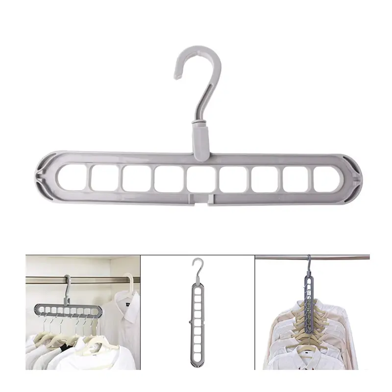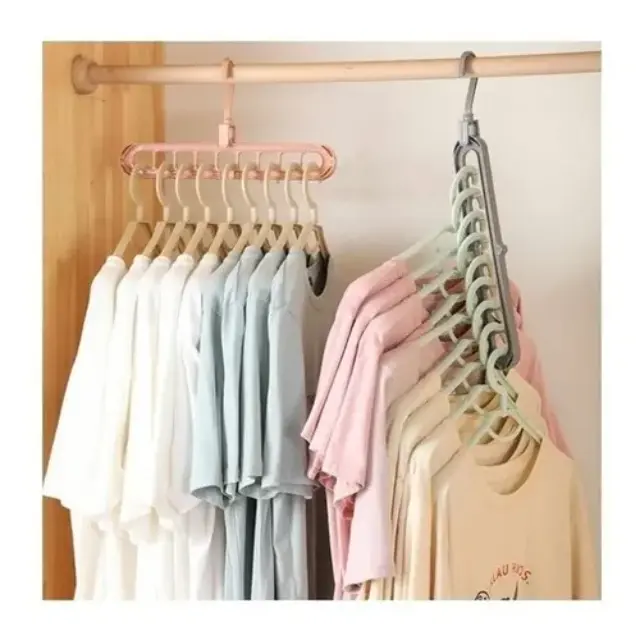 Giratorio 360º. Plegable. Antideslizante. Un gancho de 360 grados para satisfacer sus diversas necesidades de diferentes ángulos de suspensión. Cuando se usa horizontalmente, su ropa cuelga normal pero espaciada se ve mejor. Cuando se usa verticalmente, puede colgar 9 artículos en el espacio de uno.