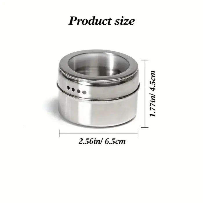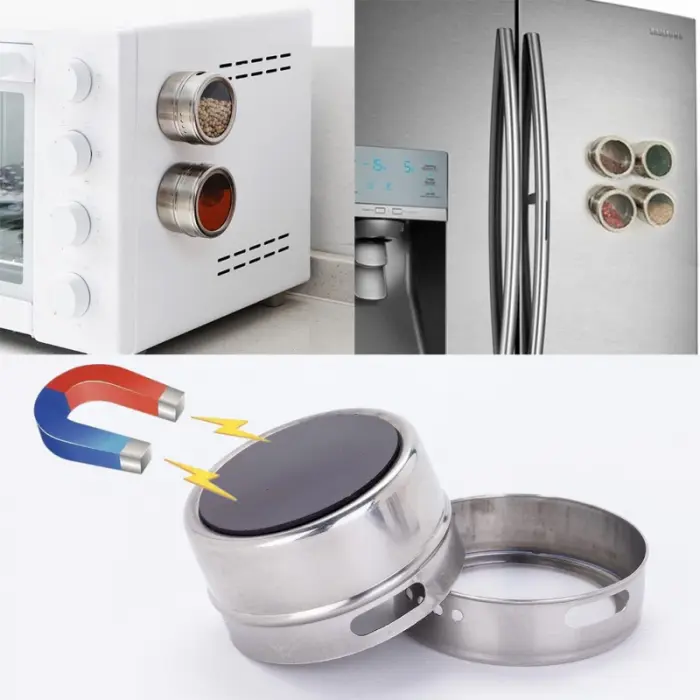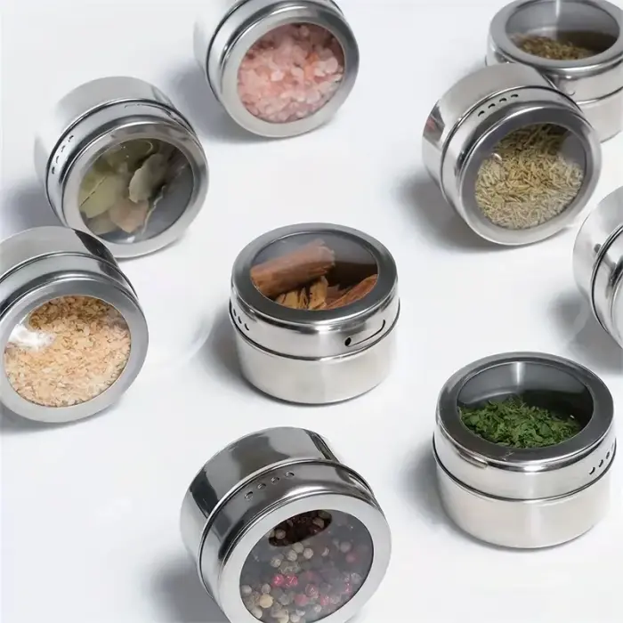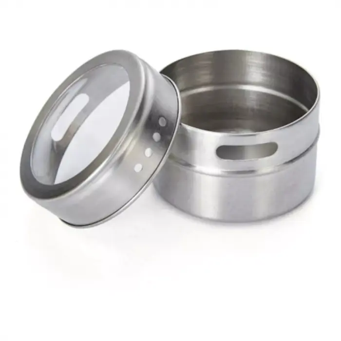 Set de 3 especieros de acero inoxidable imantados con base y con tapa transparente